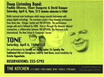 Deep Listening Band, a musical group focused on the remedial powers of sound, was established in 1988 by Pauline Oliveros, Stuart Dempster, and Panaiotis. Originated by Oliveros, the concept of Deep Listening draws attention to aural experience through the manipulation of resonance and the use of reverberant performance spaces, encouraging listeners to meditate upon the differences between instinctual and intellectual responses to sound. The group recorded their first album, released in 1990, at the Fort Worden Cistern in Port Townsend, WA in order to take advantage of the space’s extended reverberation-delay. In January of 1995, Deep Listening Band, by then comprised of Oliveros, Dempster, and David Gamper, recreated these natural reverberations with an Expanded Instrument System at The Kitchen, transporting audience-members to a space beyond their modern, Western context. The group returned to The Kitchen in April of the following year as part of Through the Distance: Musical Connections, a performance series co-hosted by The Kitchen, The Electronic Café International, The New School, and Composers’ Forum.