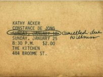 Constance DeJong (b.1950) is an American artist, writer, and playwright. She creates texts that interact with theater, performance, audio, or video works. Her multimedia, language-based pieces and collaborations make performance a natural extension of her writing. Her book “Modern Love," (published in 1977 by Standard Editions) and her poetry collection “The Lucy Amarillo Stories" were both presented at The Kitchen in 1977 with music composed by Philip Glass. In January 1976, during a collaboration between DeJong and Kathy Acker, both artists presented live and pre-recorded works. De Jong also collaborated with Tony Oursler, with whom she performed Relative at The Kitchen in March 1989.